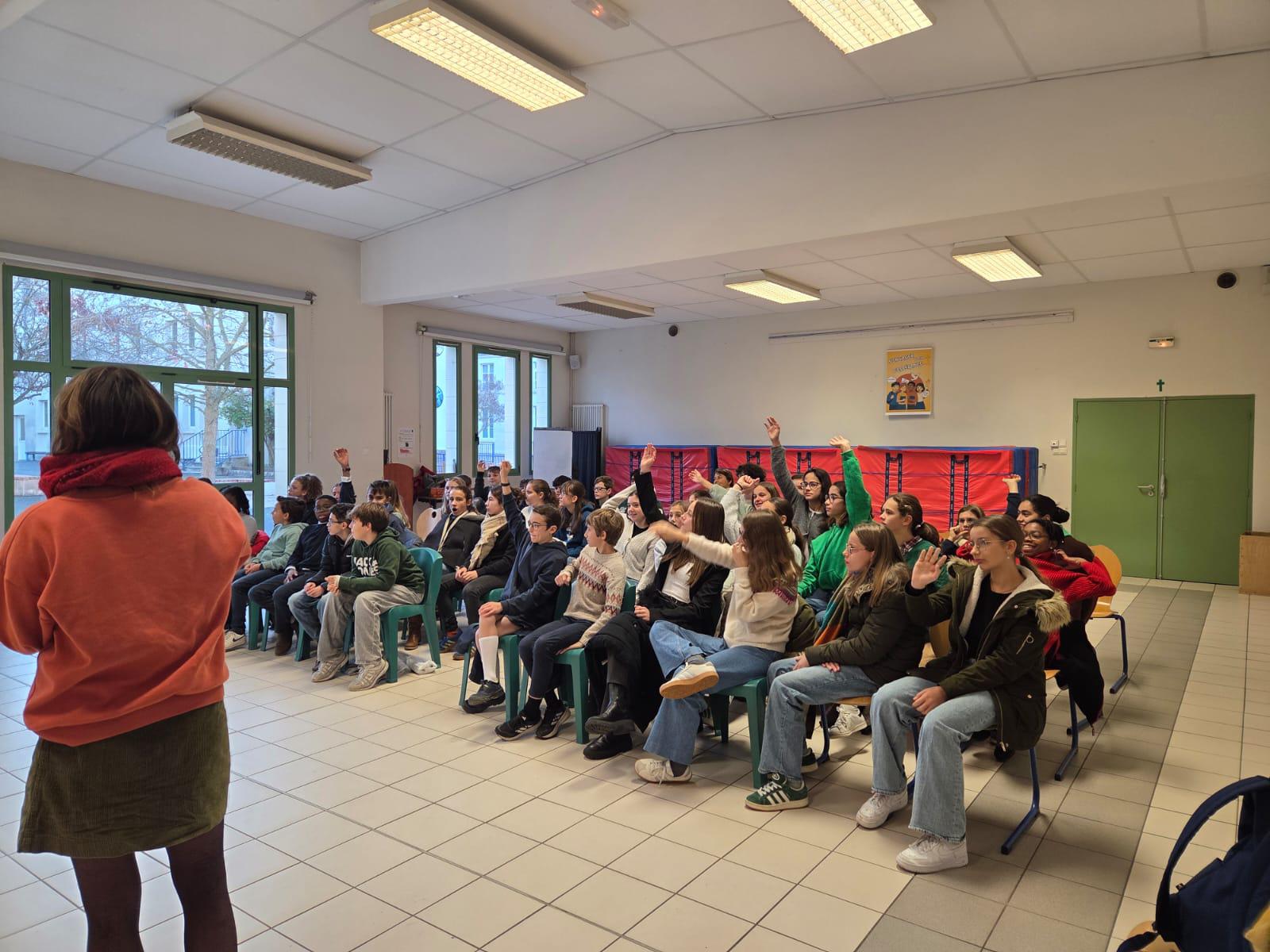 Intervention proposée par l’agglo de Saumur sous la forme d’un théâtre-forum auprès des élèves de 5e sur la notion de harcèlement. Des saynètes leur ont été présentées par la troupe Nomade I’Serane et ils ont été invités à interagir sur scène pour savoir comment bien réagir en pareille situation. Les échanges ont été très riches avec les acteurs qui ont été impressionnés par l’empathie manifestée par nos élèves et leur participation très active.
